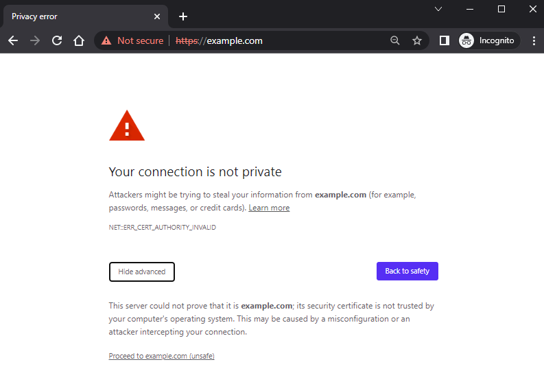 This is different if there is an ALLOW rule in place, since then, the request is examined by cloud proxy and passed over to the OCS server (https://example.com) and the website returned is example.com website containing this server's certificate.