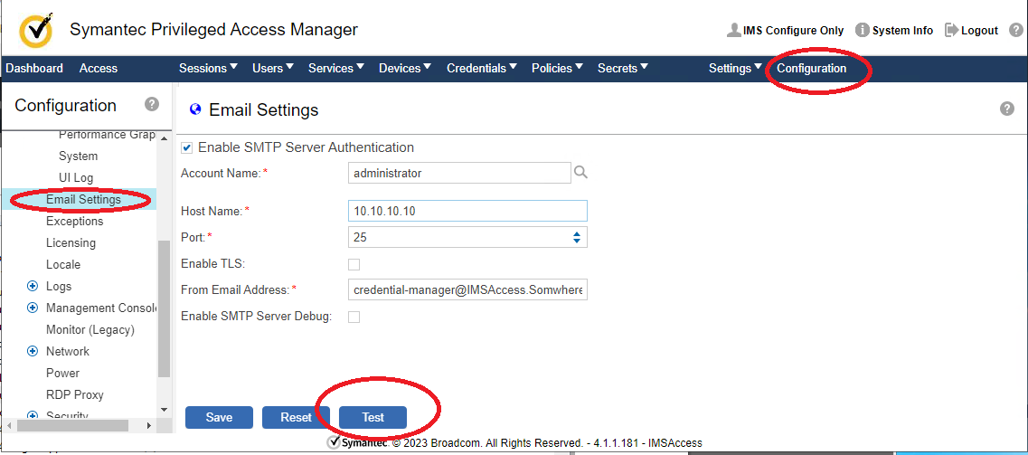 There is no test option from this configuration but if you need to simply ensure the smtp server is not blocked by a firewall you can use the email test button in the additional email configuration used for credential managenent