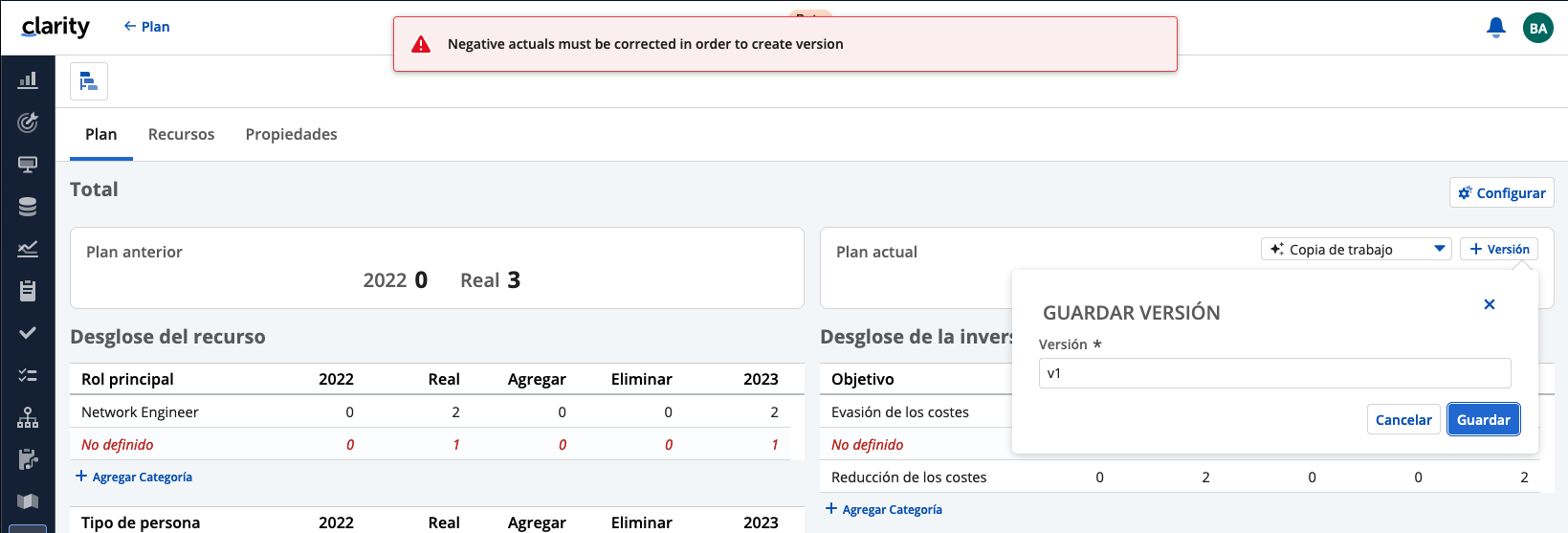 - Remove some resources under the "Resources" tab and go back to the "Plan" tab (Notice that investment table has negative actual)