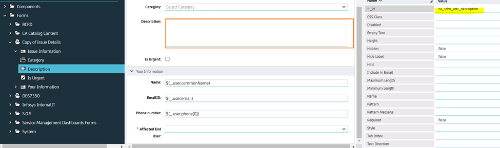 2: Create a form with following field values that are needed to create an incident like Category, effected enduser, description etc. Make sure to append ‘ca_sdm_attr’ to indicate that it is an SDM attribute (For reference, we can copy the existing ‘Issue Details’ form and paste it outside CA Service Management folder to edit and review the form)