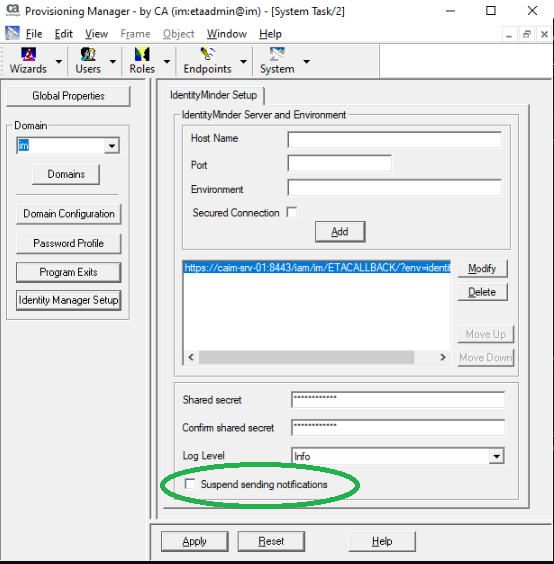 Be sure that the Host/Port/Environment and Shared Secret values are properly configured and also make sure that Suspend Notifications is not set as shown in the screenshot below: