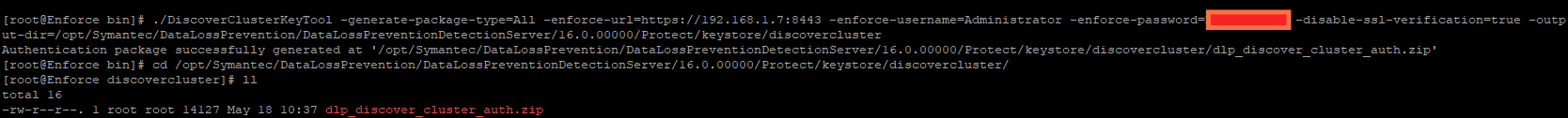 ./DiscoverClusterKeyTool -generate-package-type=All -enforce-url=https://192.168.1.7:8443 -enforce-username=Administrator -enforce-password=Password#1 -disable-ssl-verification=true -output-dir=/opt/Symantec/DataLossPrevention/EnforceServer/16.0.00000/Protect/keystore/discovercluster