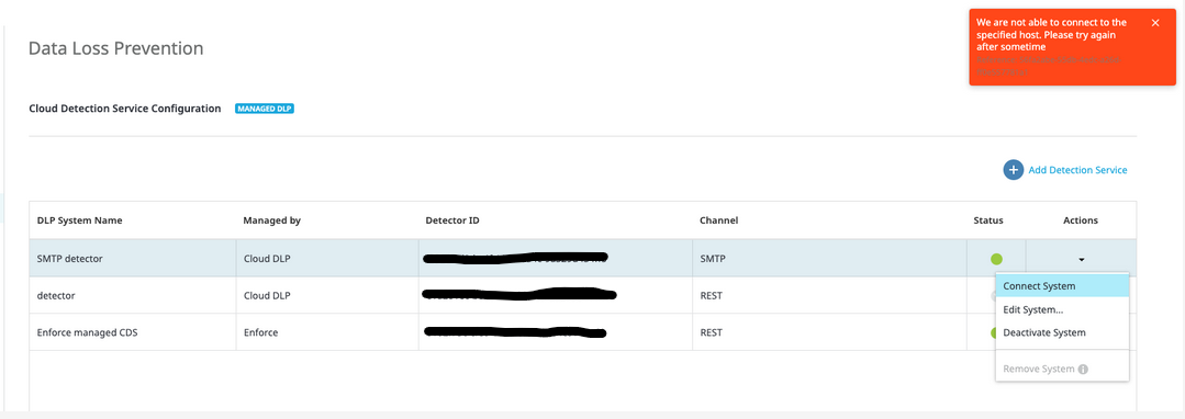 In CloudSOC -> Settings -> Data Loss Prevention, the SMTP and ICAP detectors show the following error when choosing Connect System option: