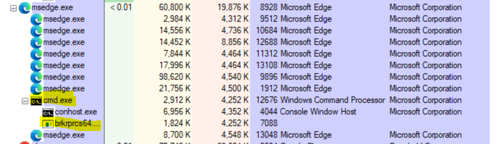 Check using process explorer if cmd.exe and brkprcs64.exe are running as a child process to chrome or edge as below.