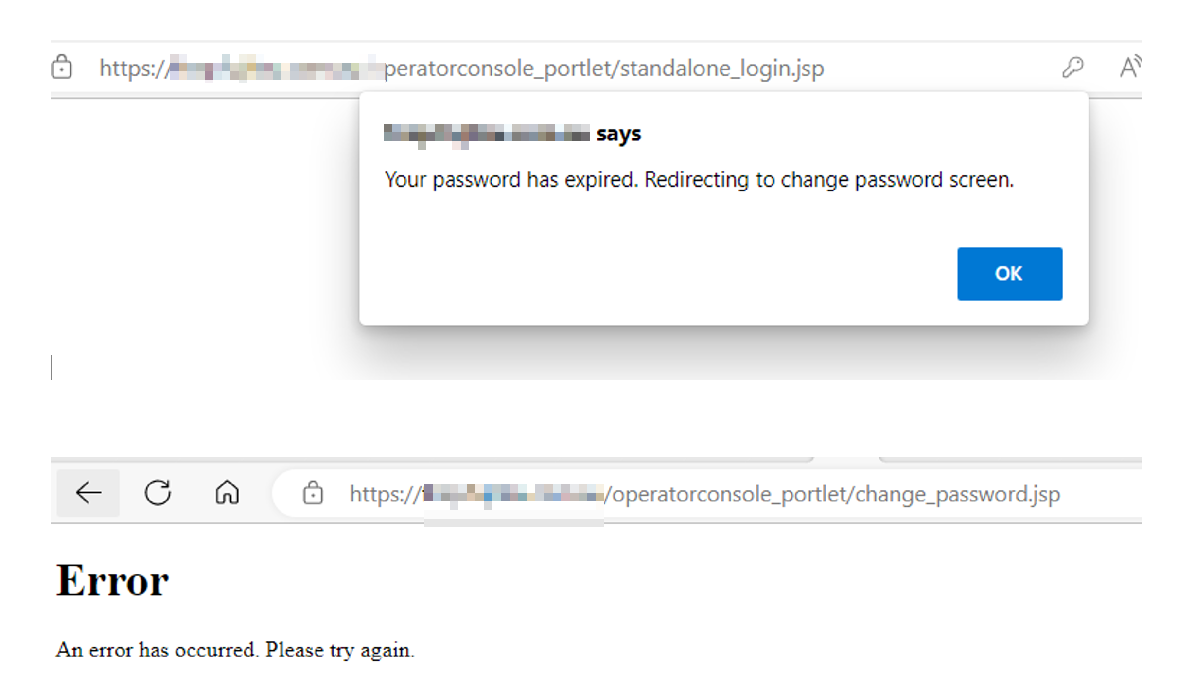 UIM portal login issue - user gets notification that his password has already expired; it then shows the "change password" link but when user clicks on it, it displays an error with no details.
