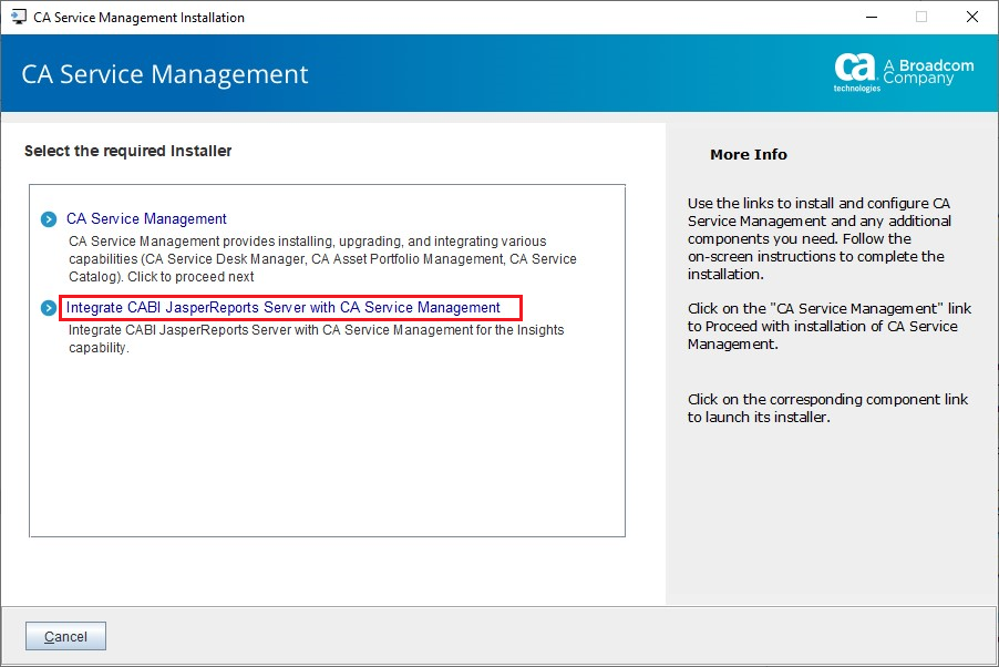 Alternatively, in later releases of Service Management, RU22 and higher, you can also run the RU22 install media from the Jasper server and select Integrate CABI JasperReports Server with CA Service Management.