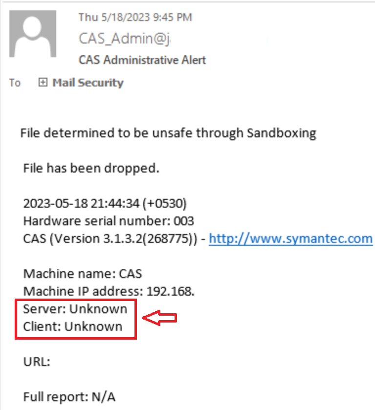 SMG is sending email to be scanned by CAS and when it trigger the alert, the notification does not have the Client IP and Server IP information in the alert notification as shown below where it shows 'Unknown' for both values.