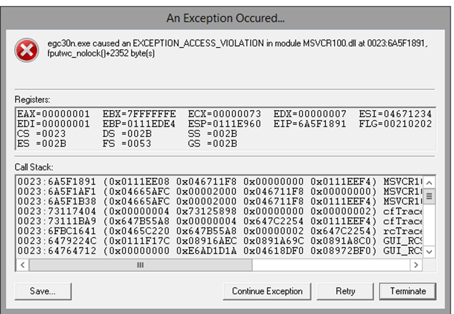 "egc30n.exe caused an EXCEPTION_ACCESS_VIOLATION in module MSVCR100.dll at 0023:6A5F1891, fputwc_nolock()+2352 bytes(s)"