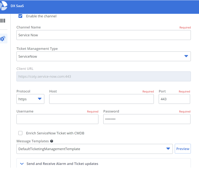 When you enable the option to enrich the ServiceNow ticket with CMDB, DX OI accesses the ServiceNow CMDB to get the appropriate values and updates the ticket with those values. DX OI uses the REST API to access the CMDB. You must provide the REST API in the CMDB URL field. (Goes on)