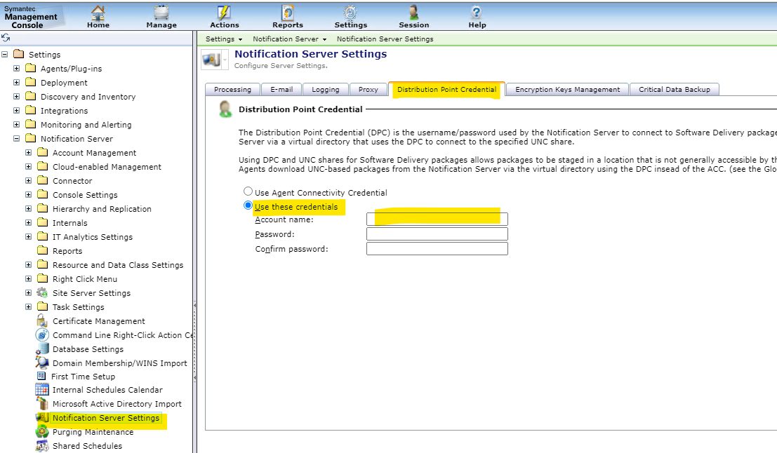 1. Go to Settings>Notification Server Settings>Distribution Point Credential
