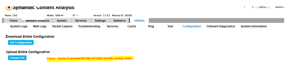 You want to restore backup of Content Analysis appliance OS by uploading the configuration file in the GUI, Utilities > Configuration : Upload Entire Configuration; However, you get the below error: