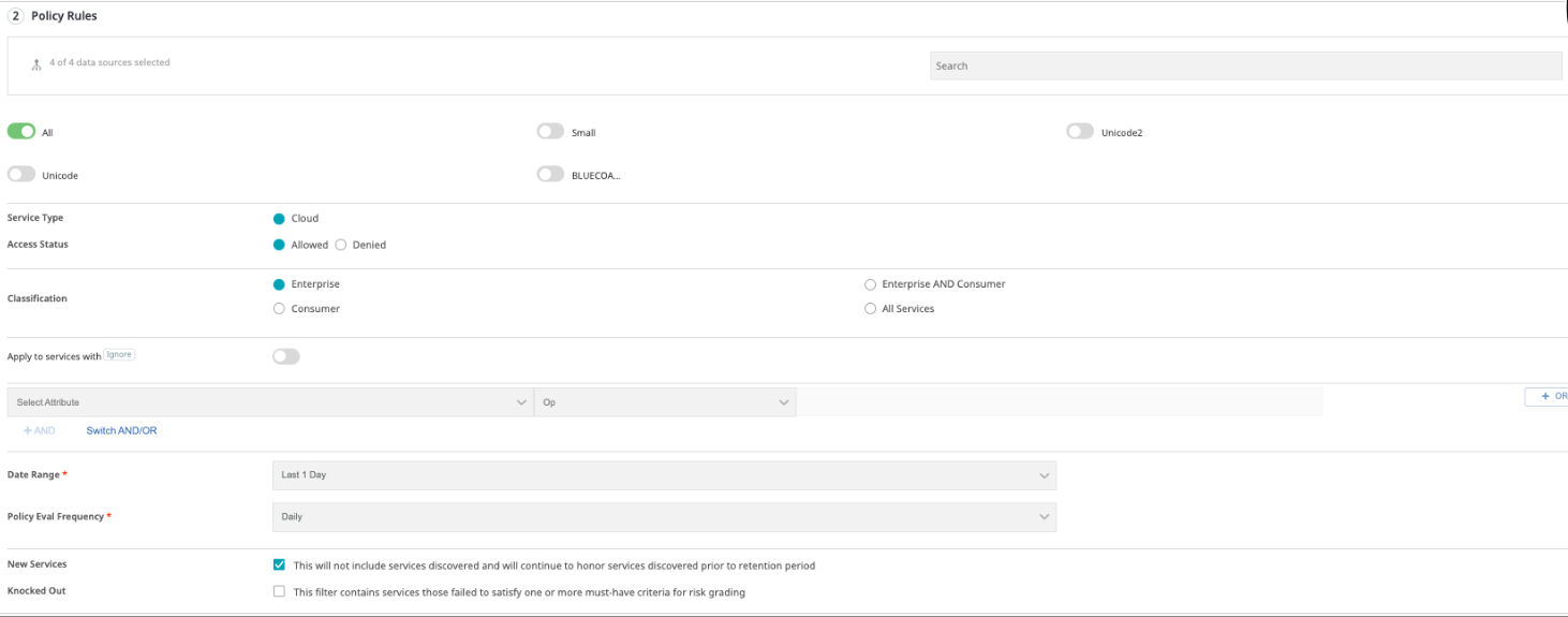 You can now create Shadow IT via Audit policies in Protect. You can build these policies using Audit filters such as service attributes and user attributes while setting the data sources, service types, policy evaluation frequency, and so on.