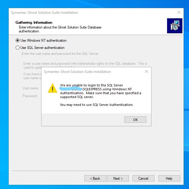 During the installation of Ghost Solution Suite a Dialog box is displayed with: