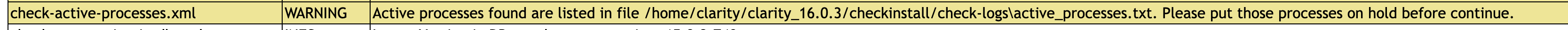 check-active-processes xml : Active processes found are listed in file /home/clarity/clarity 16.0.3/checkinstall/check-logs\active_processes.txt. Please put those processes on hold before continue message that processes are active.