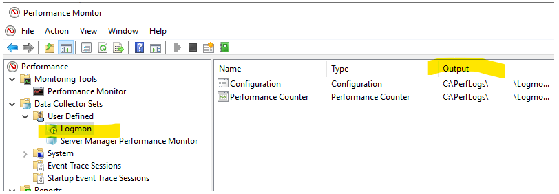 Now you are back to the Performance Monitor screen, click on the data collector set you created (Logmon)