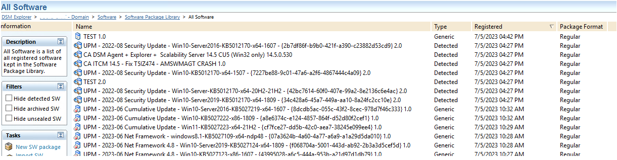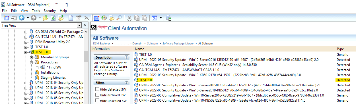 If a package is not present in Library on the new DOMAIN, the SD installed package appears with "* Find SW" procedure and an empty package with "Detected" type is created in the Library
