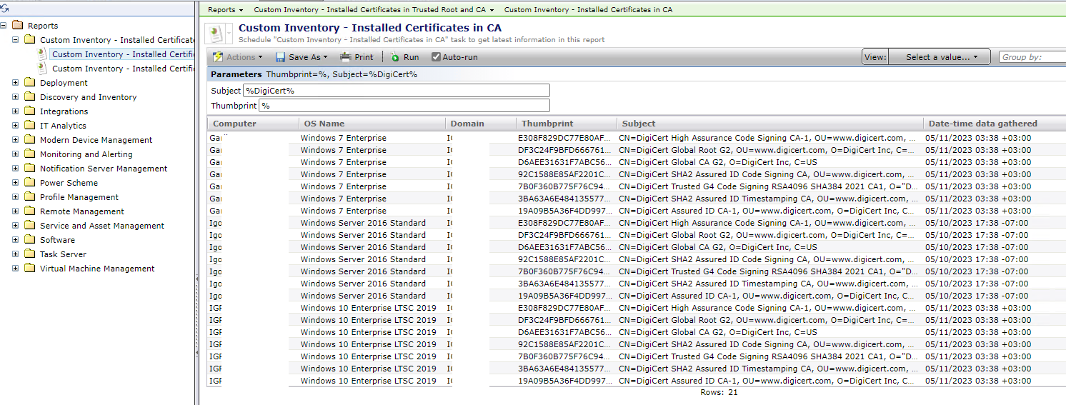 "Custom Inventory - Installed Certificates in CA" by default shows all existing certificates with Subject name like %DigiCert%: