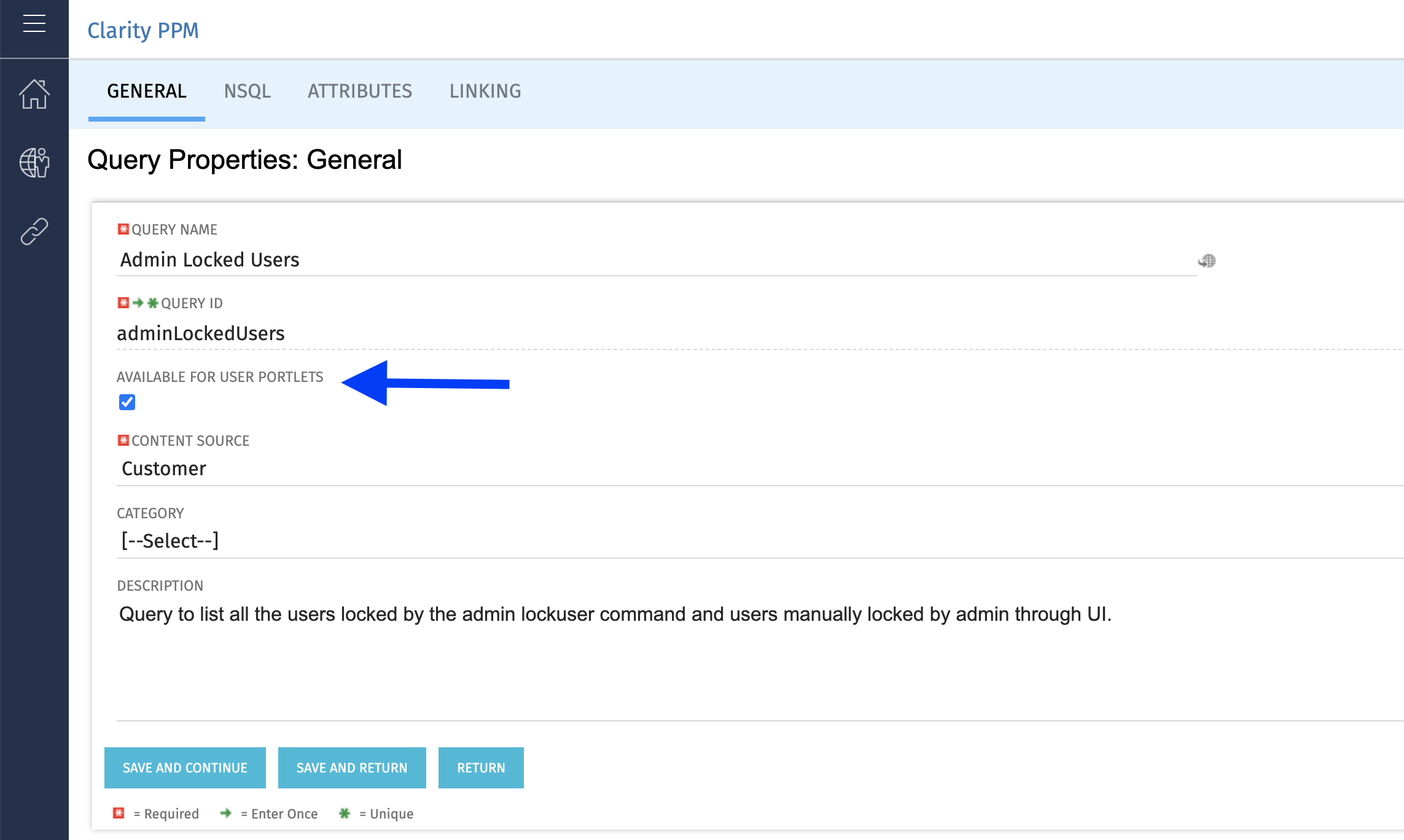 Possible workaround is to change the structure of a query by removing parameters or fields, is to uncheck "AVAILABLE FOR USER PORTLETS" from the Query properties page, Click Save and Continue to get to the NSQL tab and then proceed to modify the NSQL tab and change the structure of NSQL as desired and finally save and return.
