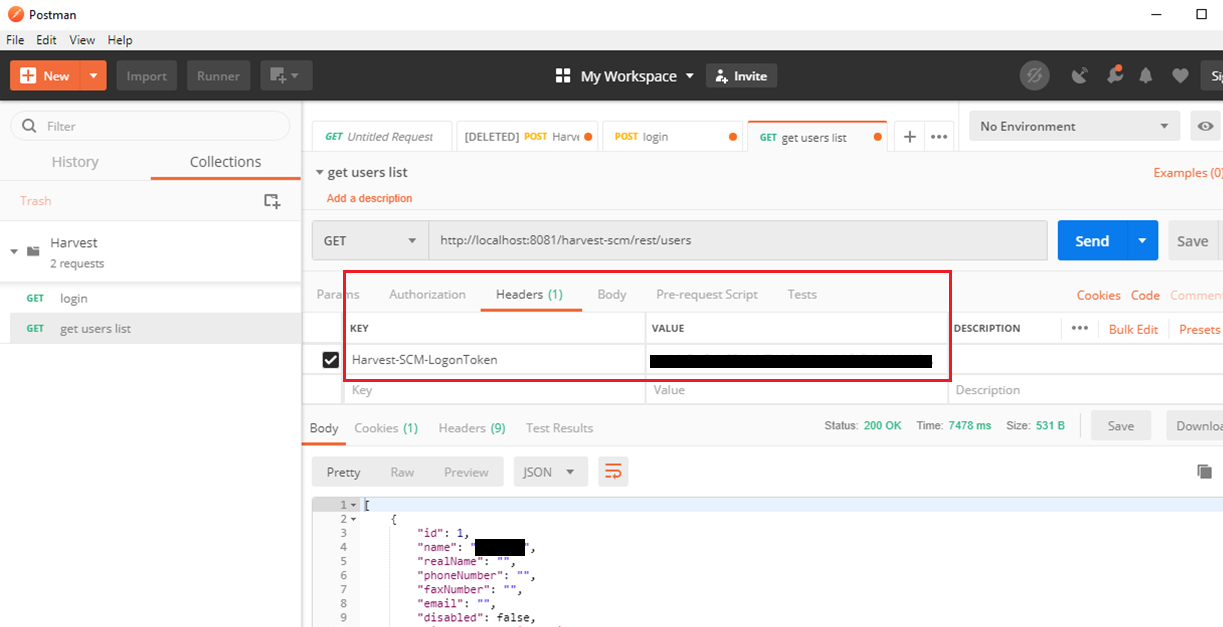 We have obtained the Harvest-SCM-LogonToken using the RESTful Endpoint: /harvest-scm/rest/login and a JSON body via Postman.