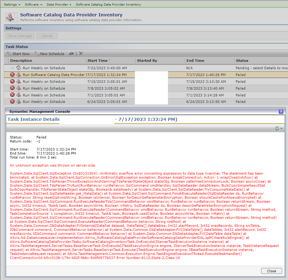 When running the Software Catalog Data Provider Inventory task, you notice it fails after just a few minutes. Looking into the result, you notice the error shown in the following screenshot indicating:
