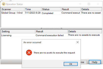When attempting to install a license to a group via the Protection Engine 9 console an error box pops up with the following message: There are no assets to execute the request