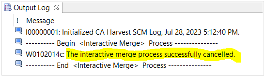 When I click on the Interactive merge option, there is an extended period of waiting time and then a message in the log that indicates the interactive merge was successfully cancelled.