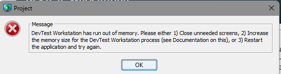 "DevTest Workstation has run out of memory. Please either 1) Close unneeded screens, 2) Increase the memory size for the DevTest Workstation process (see Documentation on this), or 3) Restart the application and try again."