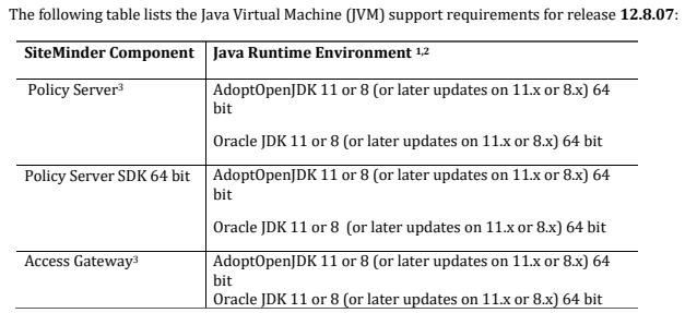 特に、Policy Sever 12.8 SP7 が Oracle JDK (5), (6) ではなく、AdoptOpenJDK を使用することを確認してください。 12.8 SP7 バージョンには AdoptOpenJDK 11 (7) が必要であることに注意してください。