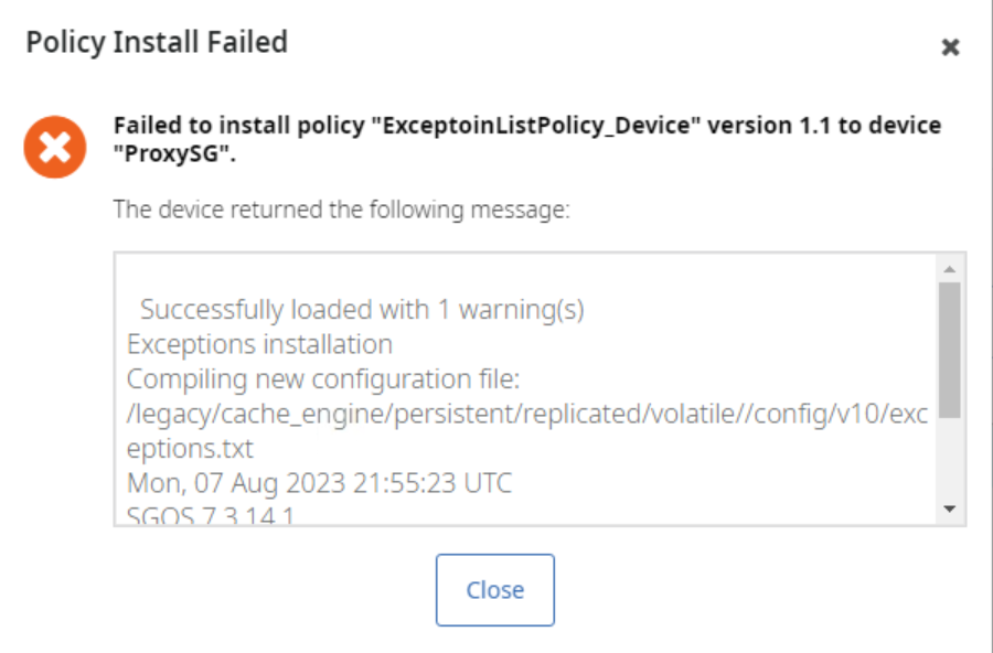 ProxySG NOTE: If you try to add the exceptions (that contains spoof_authentication_error) directly to a ProxySG unit without involving Management Center, you will get similar warning on the Proxy but the exception list gets installed successfully with Warning. The warning is silent (no popups), you see the following at the end.