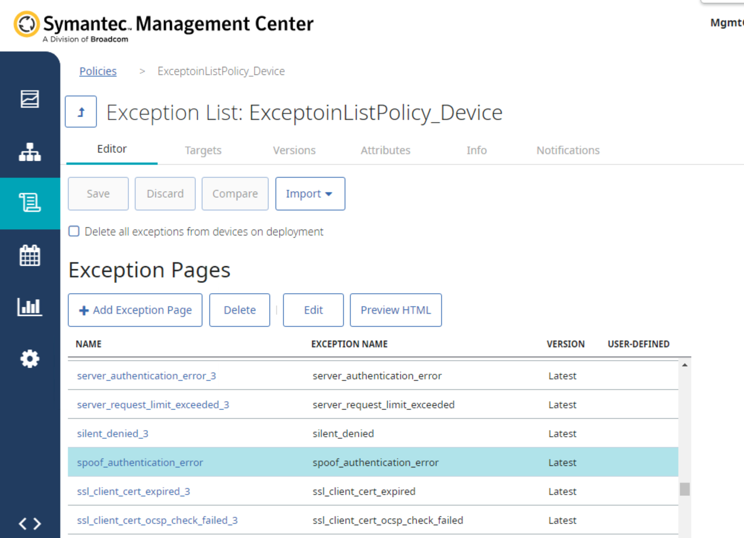 1. You will have to manually remove the exception 'spoof_authentication_error' from the Exception List Policy in Management Center after the Exception list has been imported and Save. You have to do this before you install this Policy to the Proxy Device.