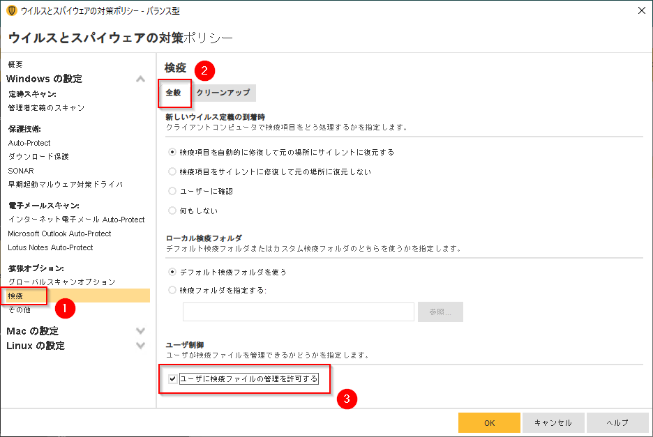 このオプションを解除するには、Symantec Endpoint Protection Manager (SEPM) のウイルスとスパイウェア対策ポリシーで [拡張オプション] - [検疫] - [全般] タブ - [ユーザに検疫ファイルの管理を許可する] を有効にします。