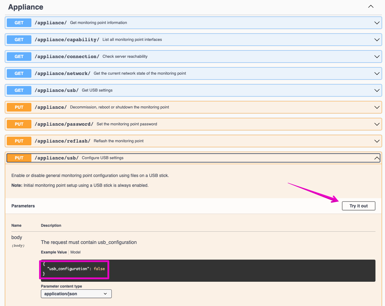 4. Navigate to the Appliance > PUT /appliance/usb.