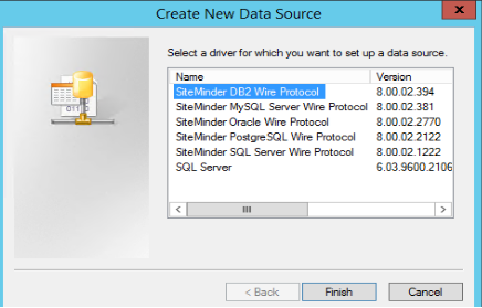 SiteMinder DB2 Wire Protocol : 8.00.02.394SiteMinder MySQL Server Wire Protocol : 8.00.02.381SiteMinder Oracle Wire Protocol : 8.00.02.2770SiteMinder PostgreSQL Wire Protocol : 8.00.02.2122SiteMinder SQL Server Wire Protocol : 8.00.02.1222 |
