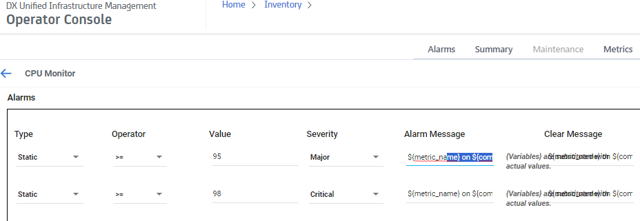 We have configured the below alarm message in the mentioned server using Alarm Policy. But it is picking up a different alarm message.