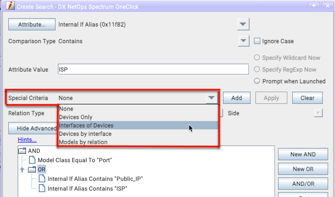 you will NOT want to use Special Criteria. When 'Interfaces of Devices' is selected it means that the search will target the Device