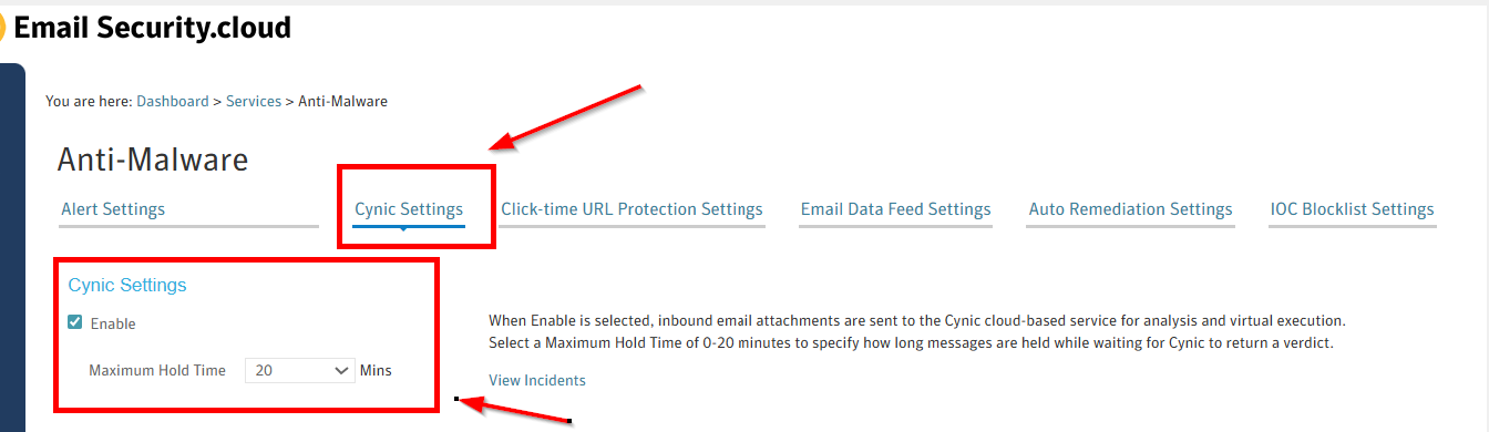 On the Cynic Settings tab, check Enable to send attachments to Cynic or uncheck Enable to disable Cynic analysis.