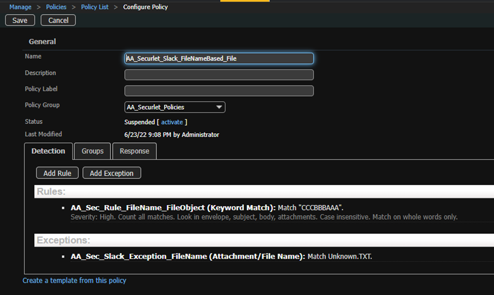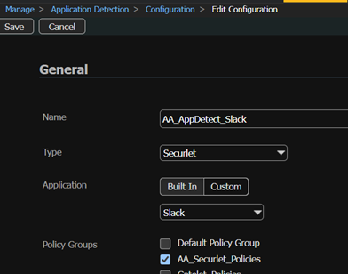 Create Application Detector/Filter for Slack Securlet and associate it with the policy group created on step one (or chosen)