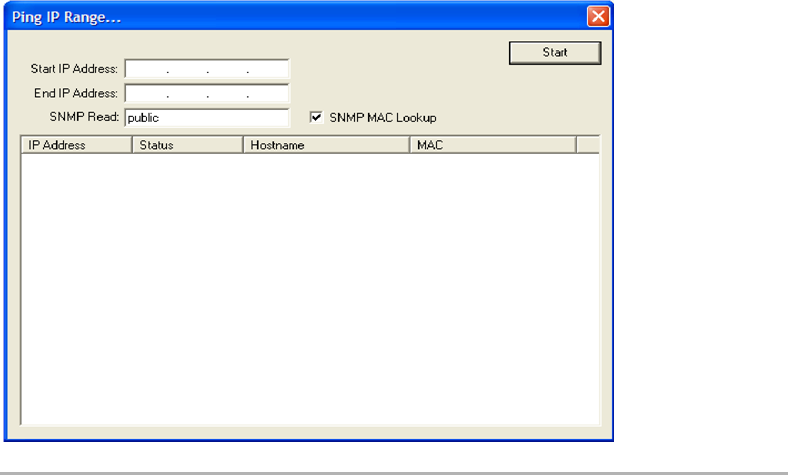 The Ping IP Range tool can be used to lookup the MAC address of the device being pinged. To be successful, SNMP must be enabled on the end device. The user can supply an SNMP Read community name to perform this operation. Otherwise, the user may clear the SNMP MAC Lookup box to ping only the end device.