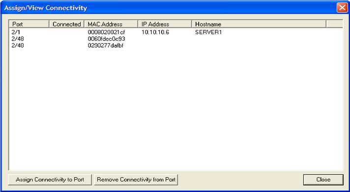 From the switch port view, right-click any switch port and click Assign/View Connectivity to determine what client or server computers are connected to a particular switch port. This dialog appears: