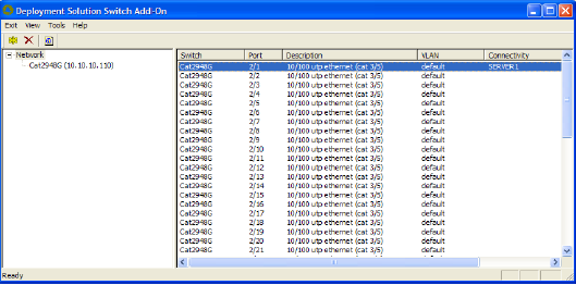 The Deployment Solution Switch Add-On program is a stand-alone application that displays a graphical view of the all switches that have been discovered along with their respective switch ports.
