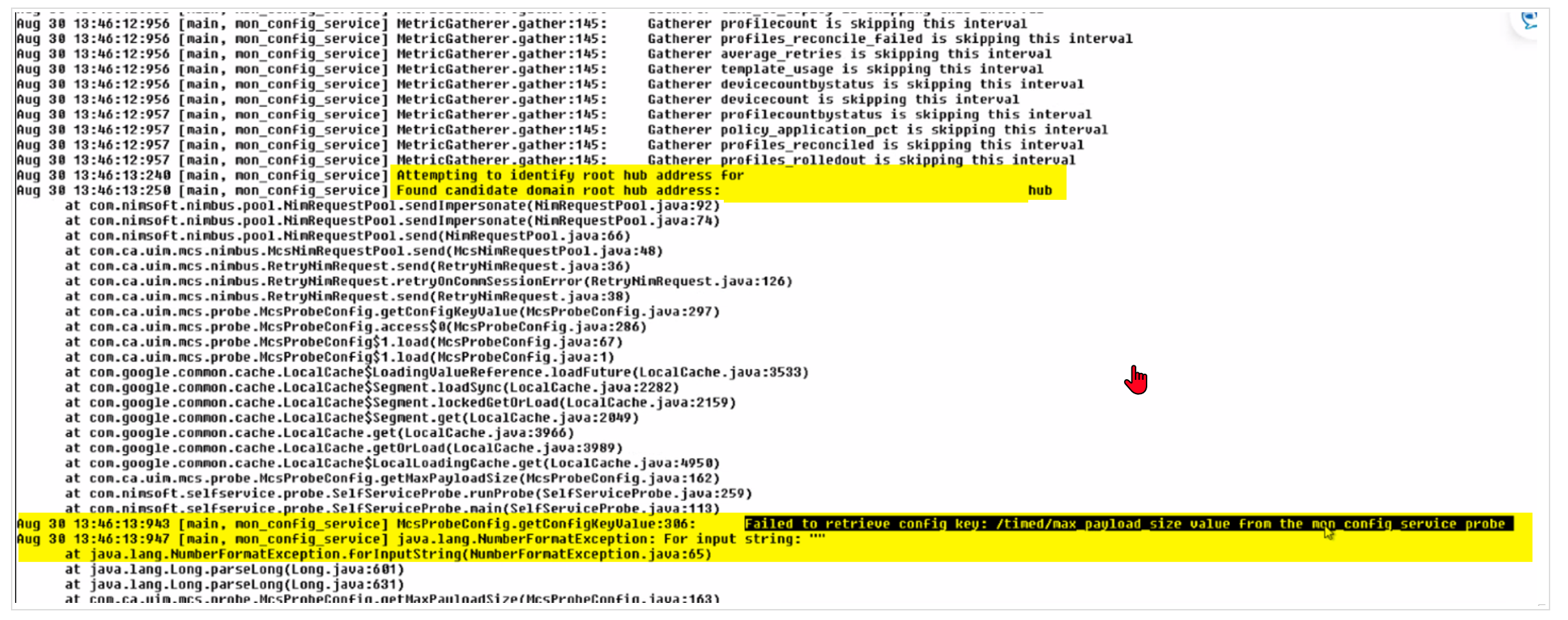 Based on the mon_config_service log as it started up ad recognized hubs in the environment, we could see that the actual Primary hub was not identified and the probe was defaulting to use a different hubs' NimBUS address. As a result, when it was trying to run the probe callback to probe_config_get, it could NOT obtain the max_payload_size parameter and value.