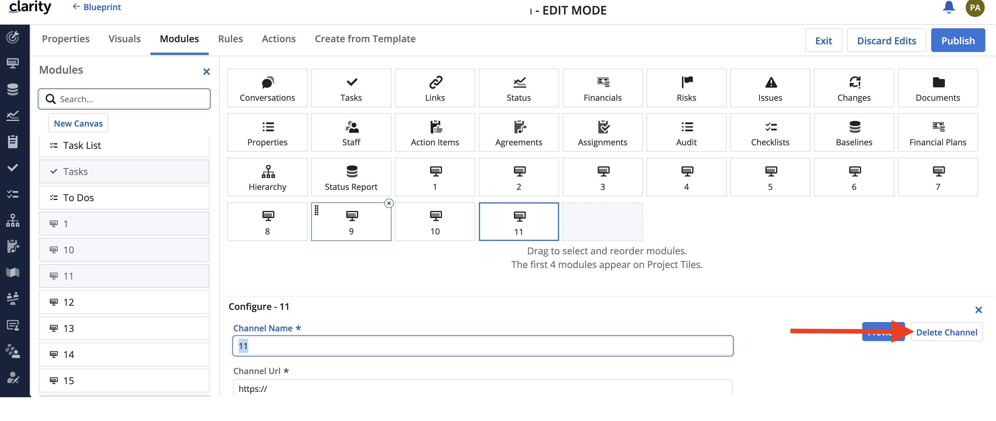 Edit the Blueprint, bring the previously created channel modules back and delete the ones that are not required and keep the limit under 15.