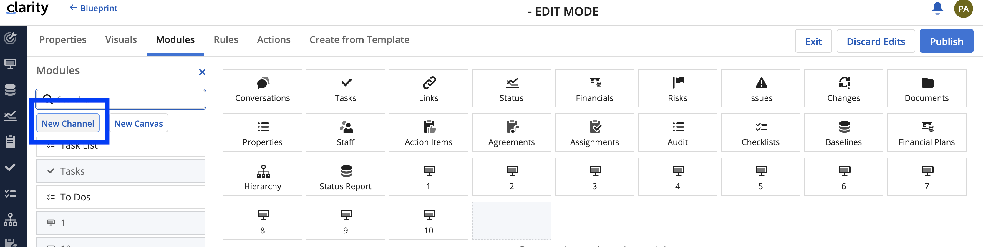The limit for active channel modules per blueprint is 15. If there is already 15 channel modules for the concerned Blueprint then the "new channel" button will be hidden.