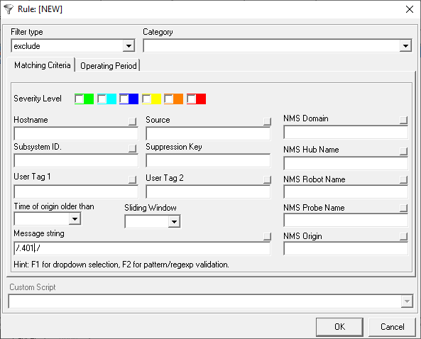 Set the message string to look for the key words in the alarm you want to exclude. In this example we want to exclude all url_response alarms that contain 401.