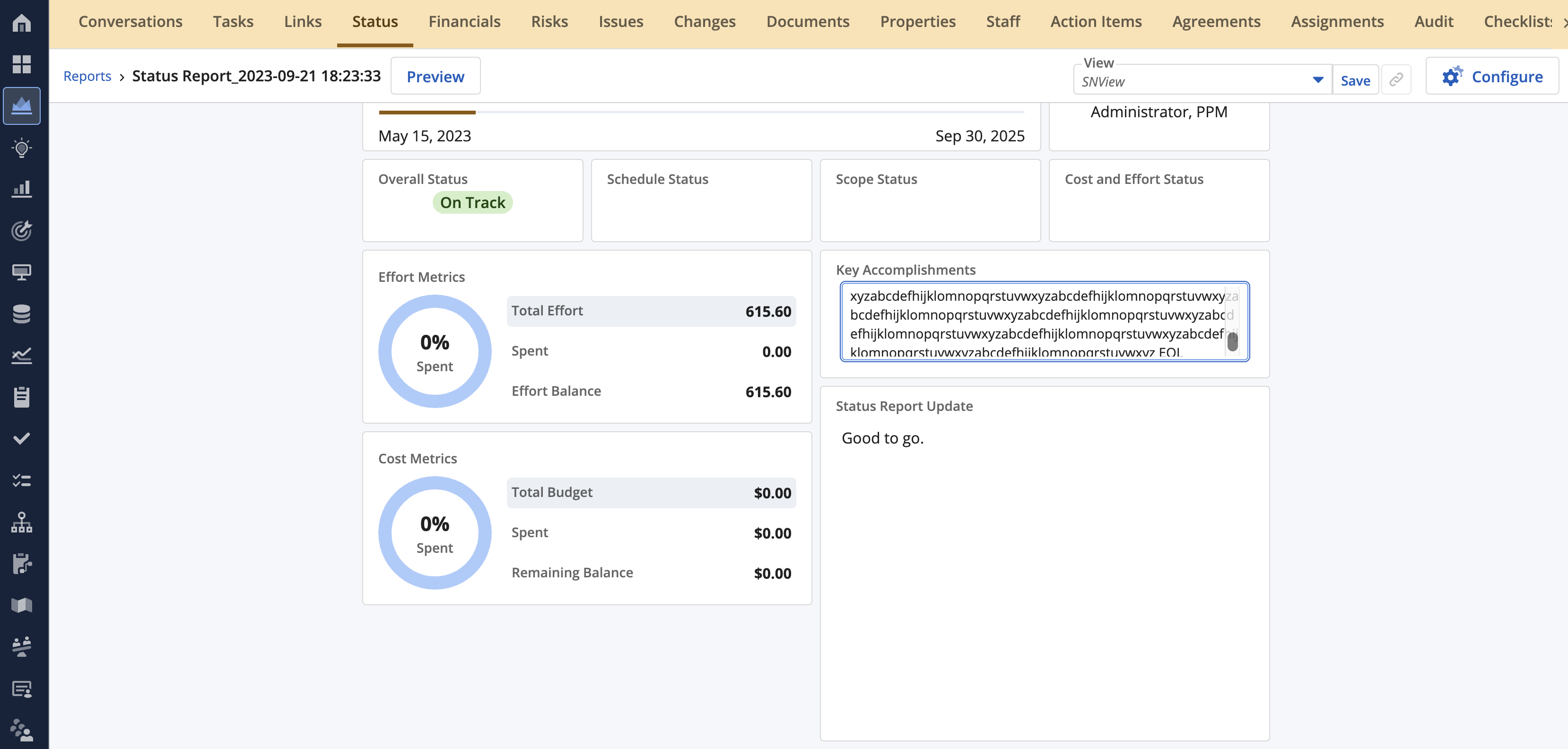 Status report canvas - Observe scroll bar for Key accomplishments: