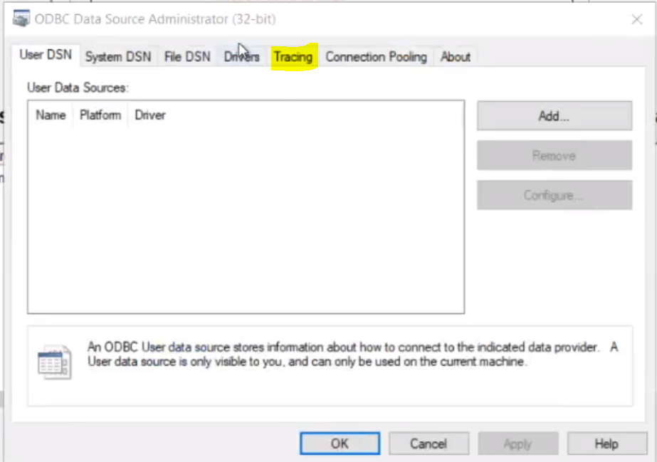 To help troubleshoot the ODBC connection failure, we enabled tracing from the ODBC Administration Utility - Tracing tab