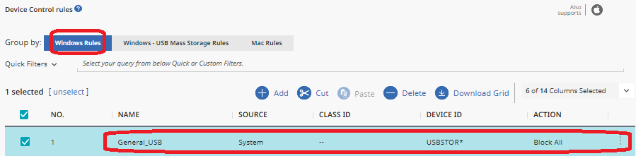 The following screenshot shows an example when the rule "General_USB" is registered in "Windows Rules". |