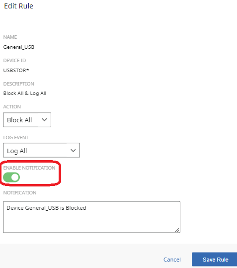 If "ENABLE NOTIFICATION" is enabled, a notification will appear when an event occurs that matches a rule in "Windows - USB Mass Storage Rules".