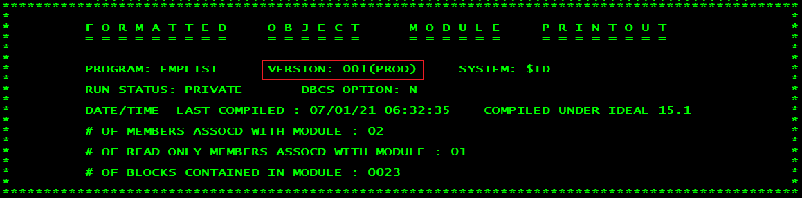 For z/OS, the output will go to the sequential file SYSDIAL. For VSE, the output will go to the sequential file SYSLST. Here is the sample output; the actual version number is 001: