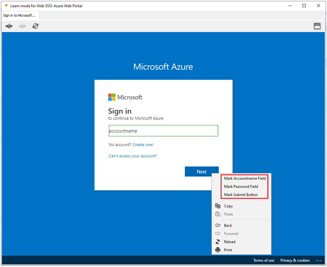 When trying to use learn mode to configure a web portal for Microsoft Azure, there is no ability to mark the Next button. The only options are accountname, password, or submit. How can the PAM web portal be configured with Microsoft Azure.